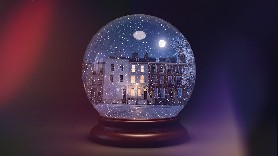 AI helped us create a moody snow globe scene, complete with dramatic lighting and our winter street view inside the globe.
